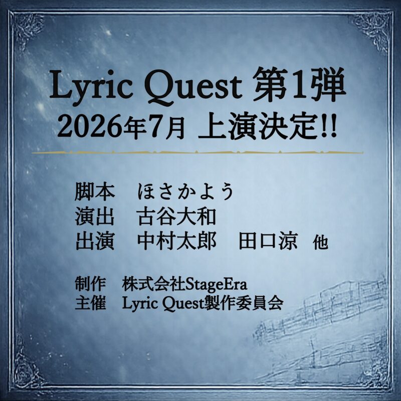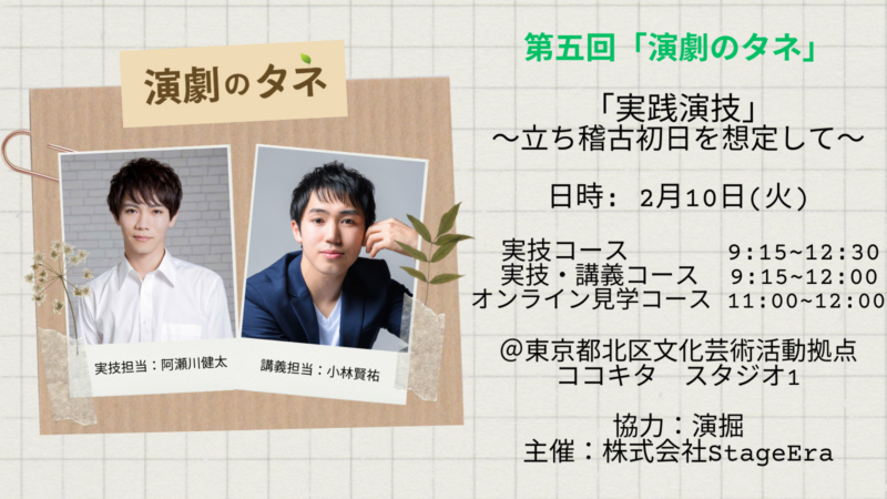 舞台に夢中な人達と時代を重ねていきたい 株式会社StageEraは、舞台制作・プロデュース・イベント企画などを手掛けます。 ScrollDown NEWS 新着情報 LyricQuest 第一弾2026年7月 上演決定!! 第五回「演劇のタネ」開催決定! VIEW MORE Stage 舞台公演 Casual Meets Shakespeare 『ヴェニスの商人 CS』 詳細を見る Workshop ワークショップ 「演劇のタネ」 共通技術を持つ役者へ 演技の上手いと下手の線引きは曖昧で、人によっても違うもの。しかし、うまく見える演技、必要な技術というのは確実に存在していると考えます。それらを言語化し、伝えるためのワークショップです。プロとして現場に立つために2.5次元舞台で演技指導の経験を持つ阿瀬川健太と演出家・松崎史也氏と長年タッグを組み、多くの舞台で演出助手を務めてきた小林賢祐が演技指導を行います。このワークショップのために作成した、現場で必要なことを盛り込んだテキストや上演台本を使用してレッスンを行います。 YouTubeへ YouTube コンテンツ VIEW MORE